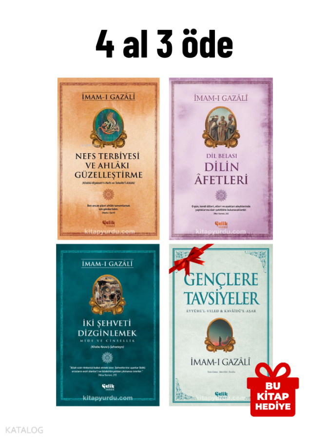 Nefs Terbiyesi ve Ahlâkı Güzelleştirme (125 Sayfa): İmam-ı Gazâlî'nin İhyâu Ulûmi'd-Din'in “Helak Edici Şeyler” bölümünden; kalp hastalıkları, güzel ahlâkın önemi ve nefsin arınması üzerine derinlikli bir eser. Dilin Afetleri (Dil Belâsı) (248 Sayfa): İmam-ı Gazâlî'nin Dilin insan hayatındaki hayır ve şer potansiyelini anlatan, sözün gücünü ve sorumluluğunu hatırlatan etkileyici bir kitap. İki Şehveti Dizginlemek – Mide ve Cinsellik (128 Sayfa): İmam-ı Gazâlî'nin Nefsi terbiye etmenin temel alanları olan yeme ve cinsellik konusunda riyâzet ve ölçü dengesini kavrayın. Gençlere Tavsiyeler (Eyyühe'l-Veled & Kavâidü'l-Aşar) (68 Sayfa): Gazâlî'nin gençlere ve ahiret yolcularına yönelik kısa ama derin tavsiyeleri, hayatı anlamlandırmaya yönelik sade bir kılavuz. Bu set, ahlâkî gelişim, nefis muhasebesi ve manevî olgunluk arayışında olan herkes için kaynak niteliğinde. Kolay anlaşılır diliyle her yaşa hitap eder.